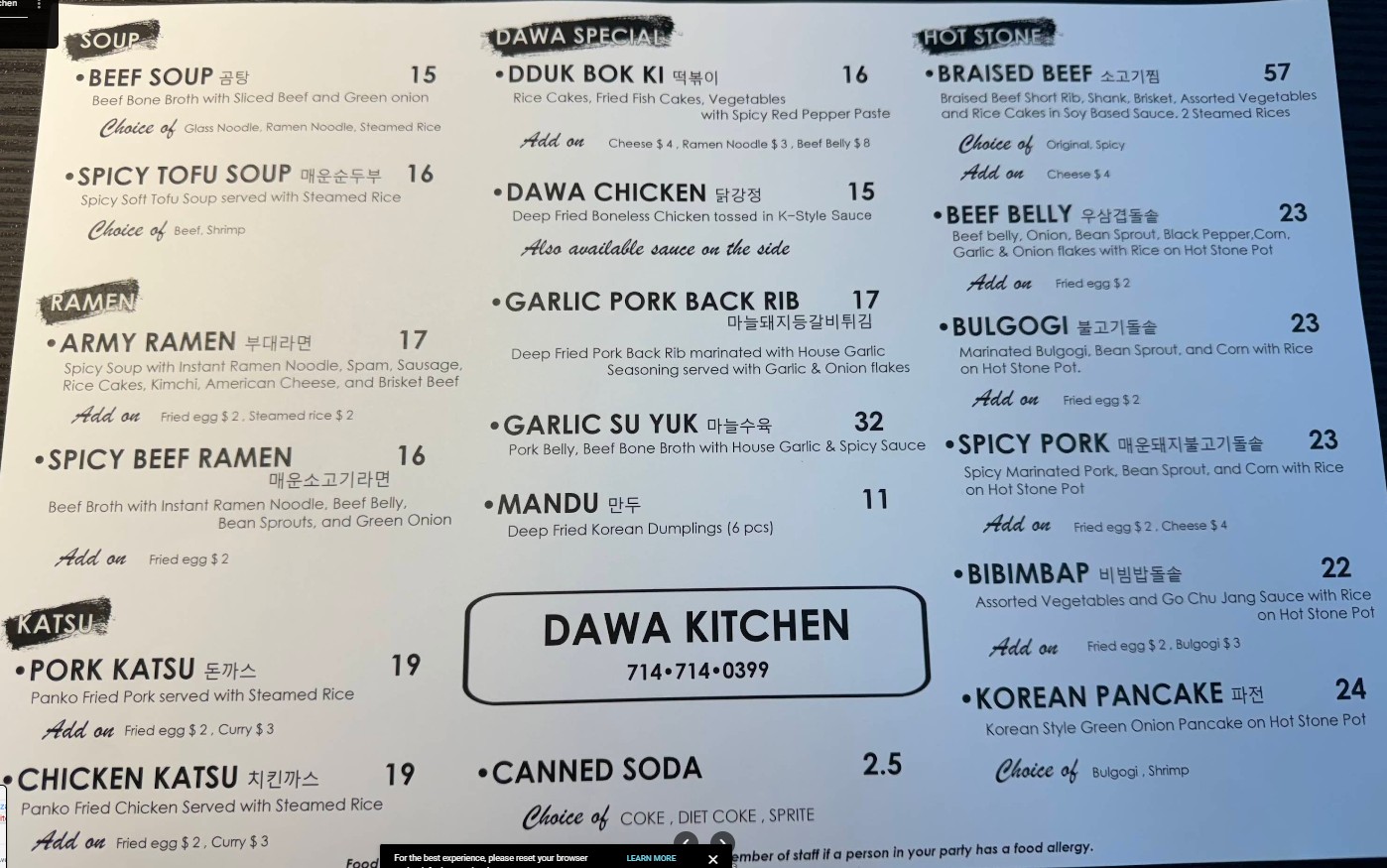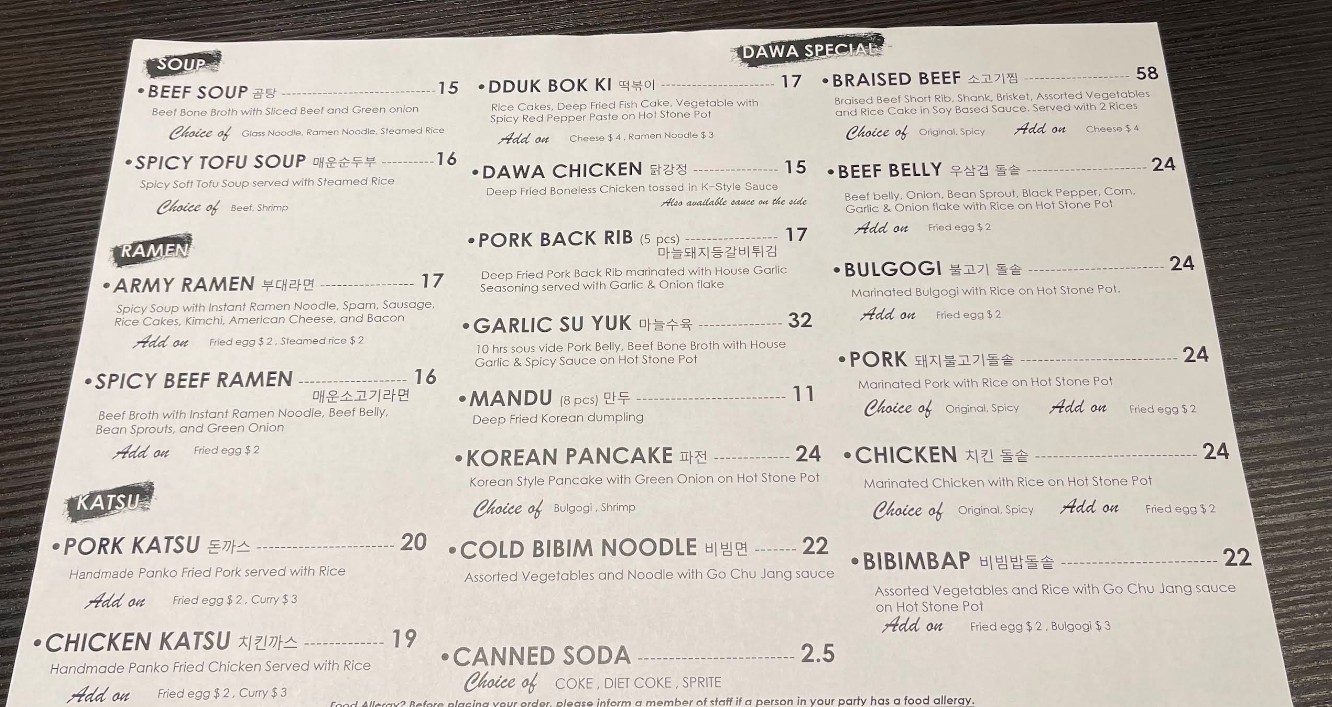 Welcome to Dawa Kitchen, where we bring the authentic taste of Korean cuisine to Garden Grove. Our restaurant serves a variety of mouthwatering dishes made with fresh ingredients and traditional Korean recipes. From savory BBQ options to flavorful stews, our menu has something to satisfy every palate. Whether you are here for a quick meal, a family gathering, or to experience Korean flavors for the first time, we are excited to welcome you and offer you a dining experience like no other! Enjoy our carefully curated menu filled with all-time favorites and seasonal dishes. Come in, take out, or order for delivery — the choice is yours!